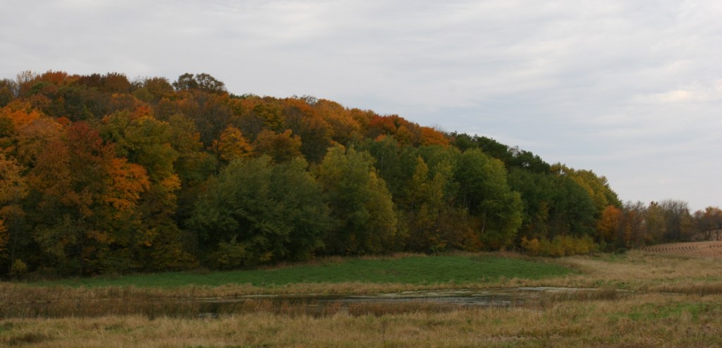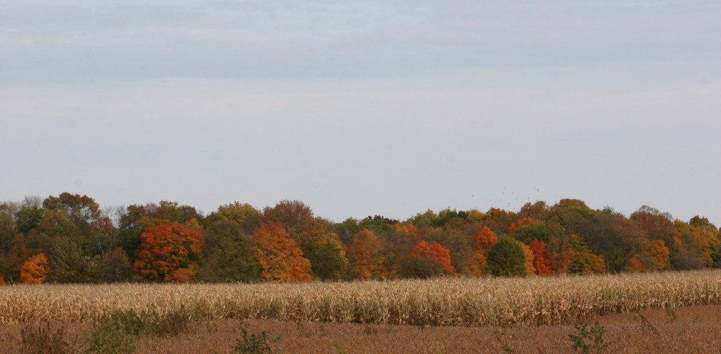 Traveling at a slower pace allows for taking in the unfolding landscape. Cornfield nudging a clump of colored trees. So much to see if only we look.