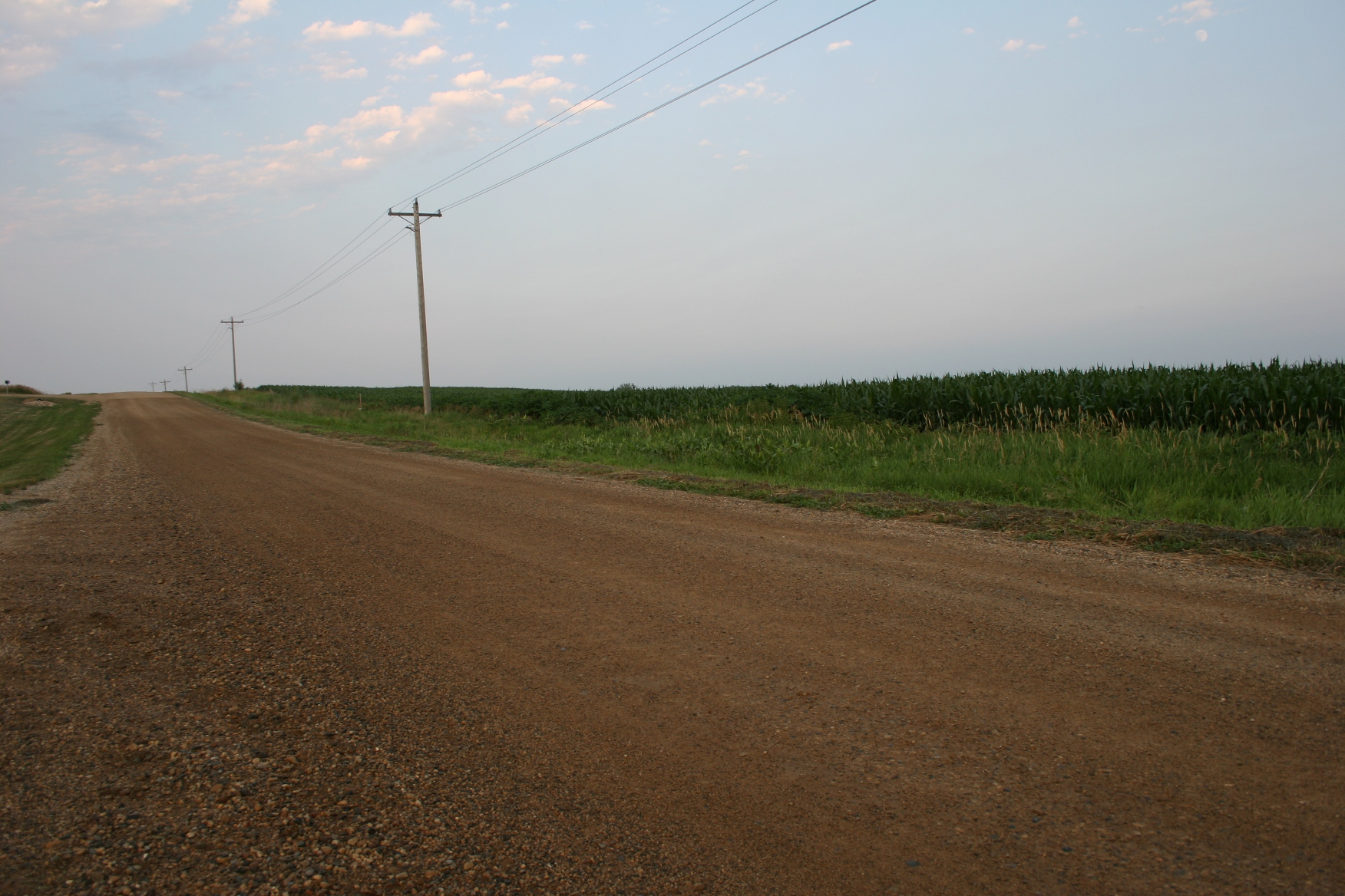 As the sun sets on the prairie, a truck travels along a gravel road up to a paved roadway north of Lamberton.