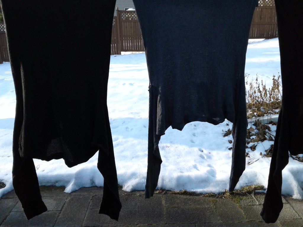 Then I headed back outside, remnants of snow remaining on the lawn near the patio where my removable clothesline stretches. The towels were already stiff, frozen.