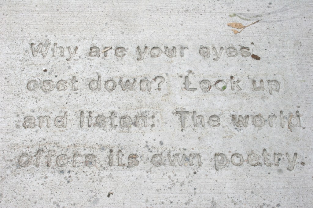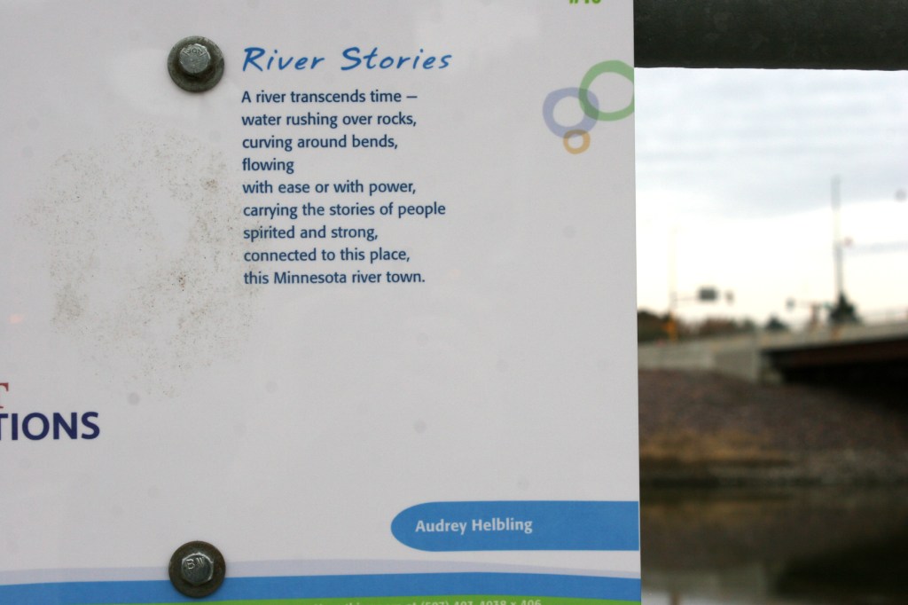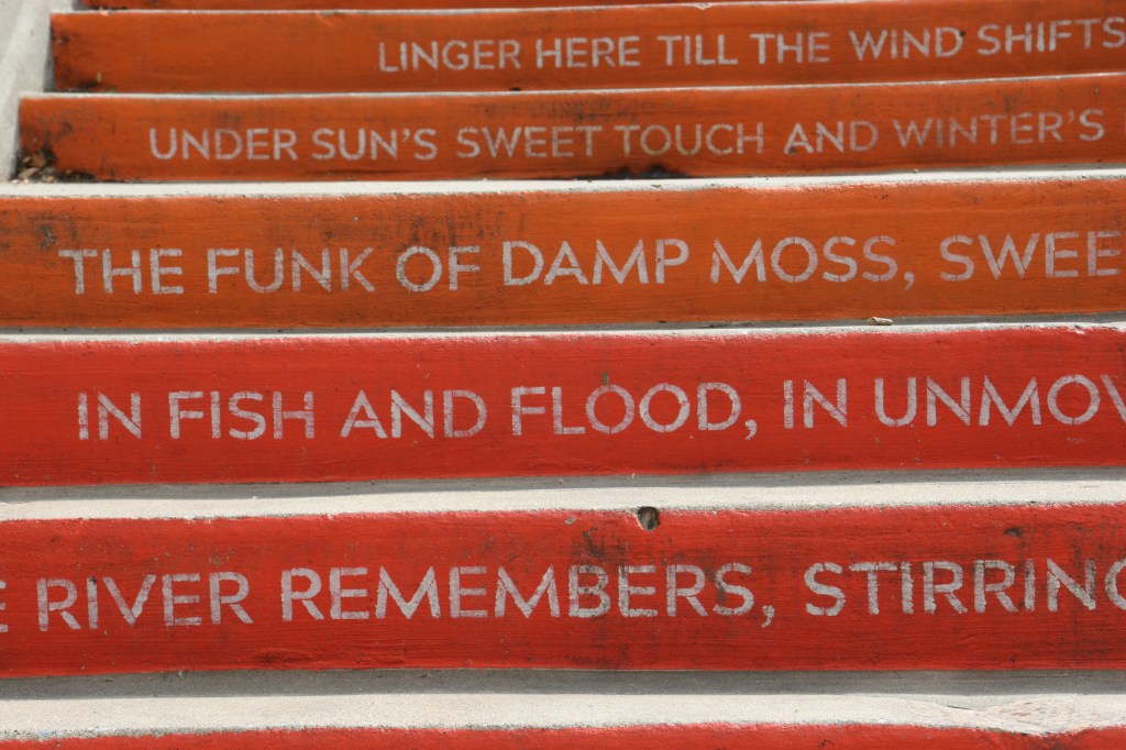 I FEEL FORTUNATE to live in an area of Minnesota which values poetry. Some 20 minutes away in Northfield, poems imprint upon concrete throughout the city as part of the long-time Sidewalk Poetry Project. Along the Riverwalk, a poem descends steps. In the public library, a poem graces the atrium.