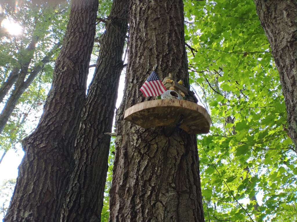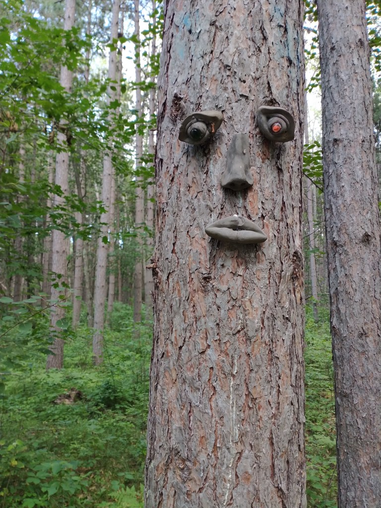 And so Randy and I hurried along the 3/4-mile loop, me swatting away bugs while trying to spot tree gnomes in the midst of the woods. I found only three tree gnome sites, plus a bonus face on a pine. But it was enough to satisfy me. I’ll resume my gnome search upon a return here in the fall, when the weather cools and mosquitoes are perhaps less prevalent.