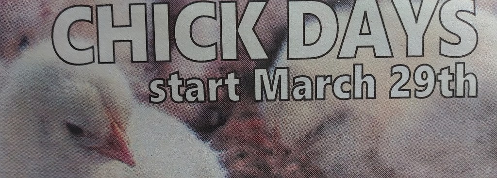 Today, chicks still ship via mail, but need to be picked up at the post office or at a local supplier on “Chick Days.” That may be at a farm store, a grain elevator, a feed store…