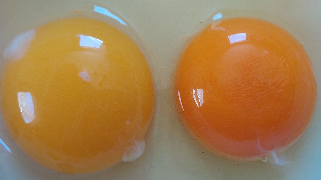 Given my history, I’ll never own chickens. But I eat chicken. And I eat eggs. I especially like farm fresh eggs from free-range chickens. The dark orangish-yellow yolk hue, the taste, are superior to mass-produced eggs.