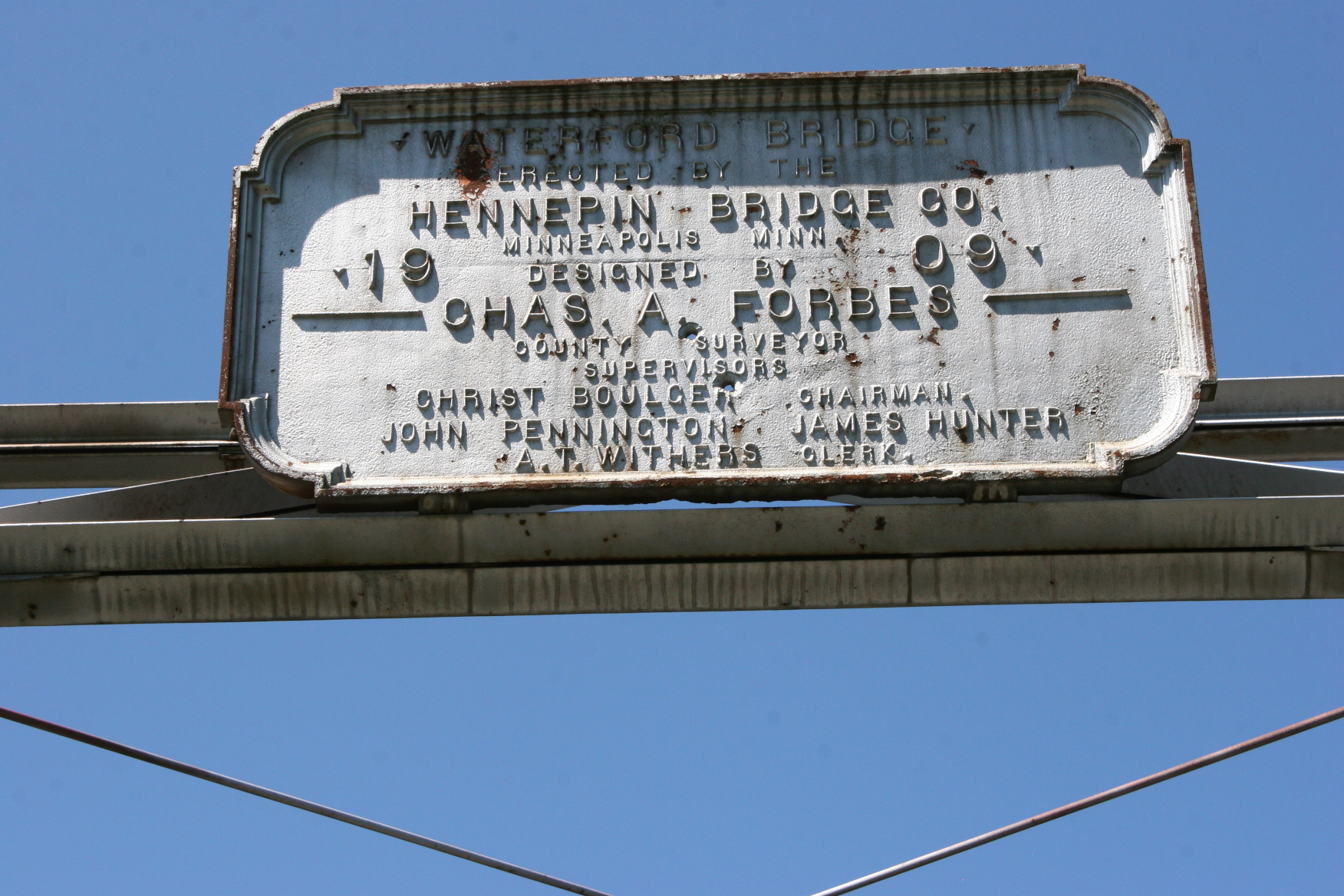 Historical details on a sign posted high above the bridge deck of the historic Waterford Bridge over the Cannon River in Dakota County. Minnesota Prairie Roots file photo August 2020.