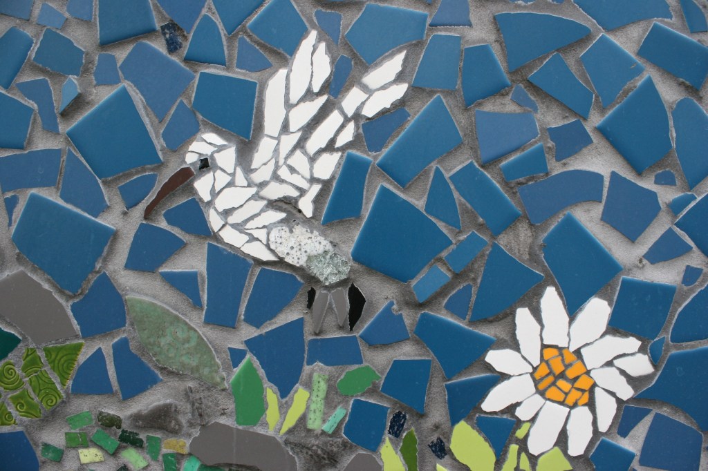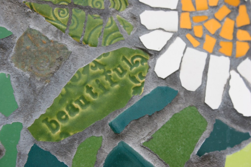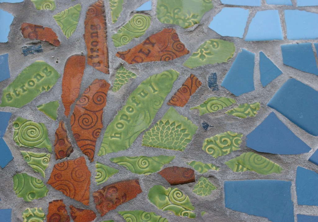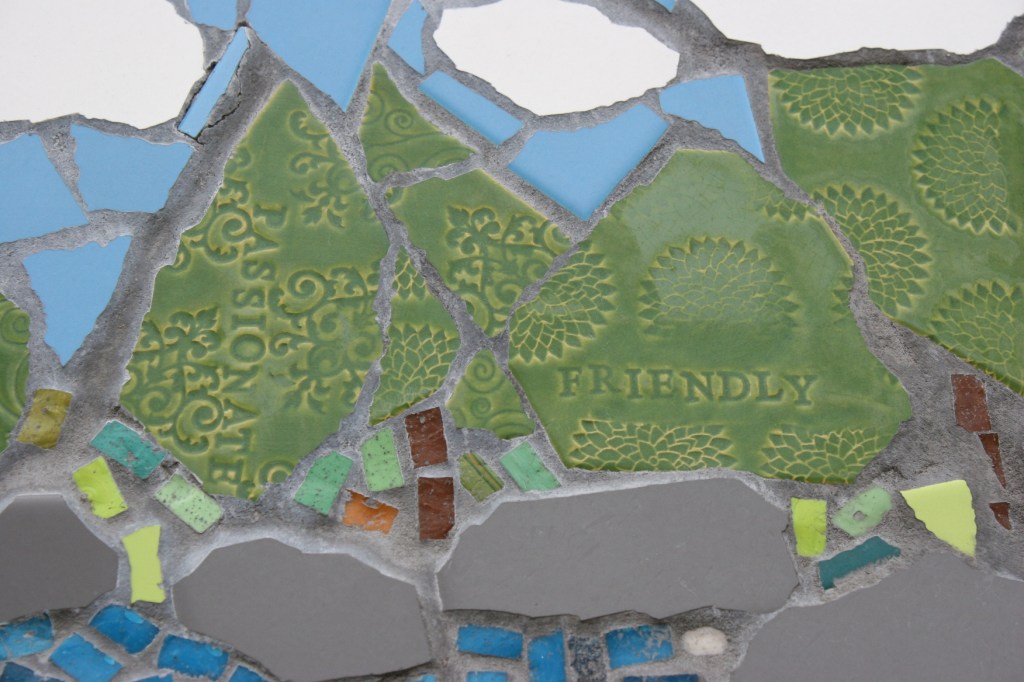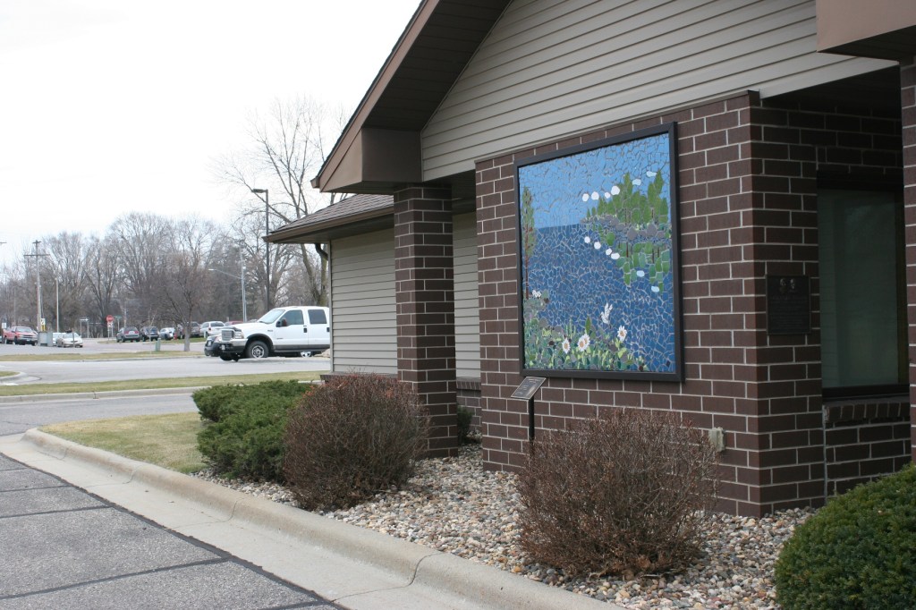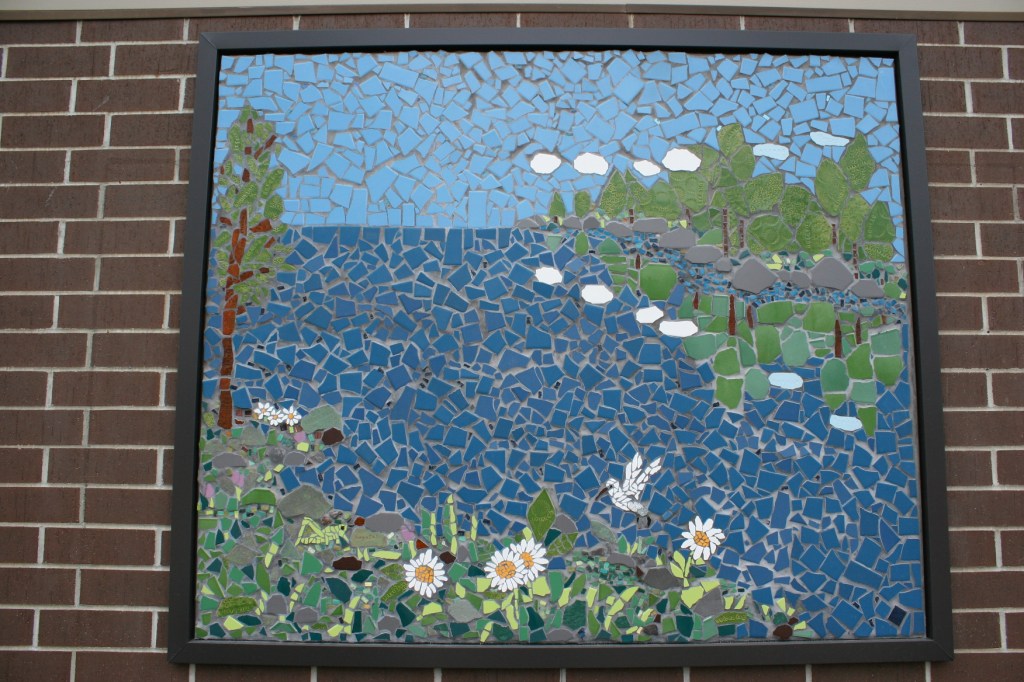 I appreciate how Ward melded art and nature in creating a mosaic which honors both. As I studied her interpretation of the Cannon River, I recognized the thought she invested in this detailed art of many many pieces. Her river evokes movement in waters teeming with fish and the occasional turtle. Assorted greens and blues evoke a sense of calm and peacefulness. Ward’s art honors this river which runs through. This river of life, now a backdrop to a community which still appreciates her beauty, her recreational qualities, her history, her aesthetic value.