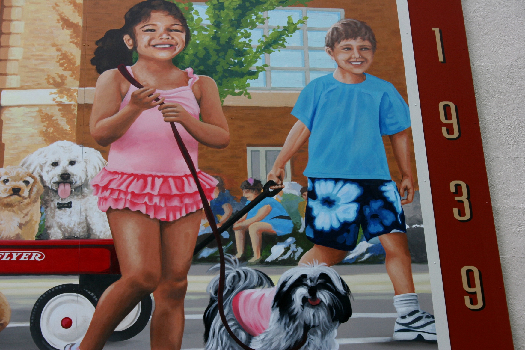 The Central Park Bandshell mural on the left honors Bishop Henry Benjamin Whipple. The one to the right features the Faribault Pet Parade and was placed there several years ago.