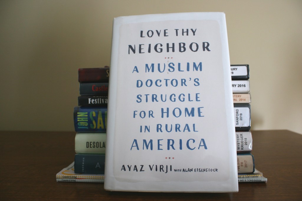 Since then, I’ve been happily reading my stash of Minnesota-authored books. Only one—Love Thy Neighbor, A Muslim Doctor’s Struggle for Home in Rural America by Ayaz Virji with Alan Eisenstock—was not on my list. I spotted the book on a shelf of library staff picks, this one recommended by Sue. I read the book in a single day. One day. That’s how good this book is and how necessary to read. Especially today when headlines daily reveal instances of hatred, racism and so much more dividing our country. Insensitive, inflammatory, just plain horrible words and actions, including in southern Minnesota.