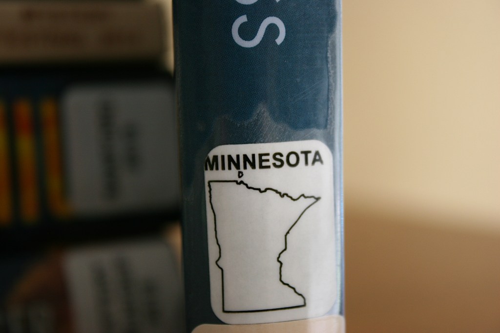 I especially enjoy reading books by Minnesotans and appreciate the Northfield library tagging these books with Minnesota-shaped art.