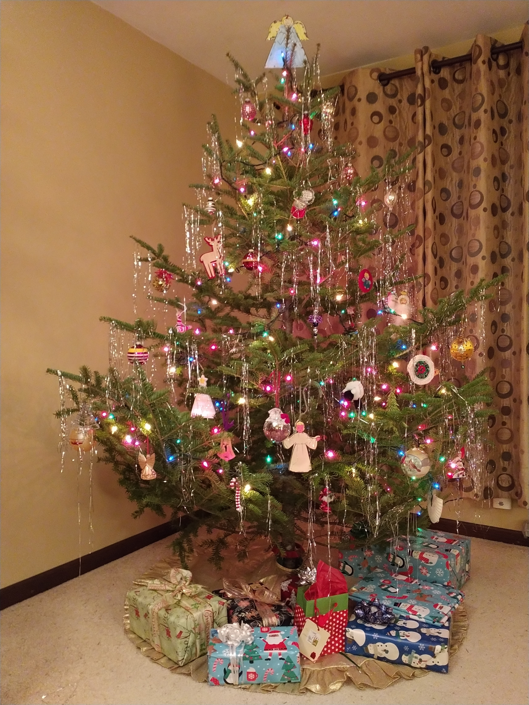 In the old 1 ½-story wood-frame farmhouse where I lived the first 11 years of my life with my parents and four of my five siblings (Brad wasn’t yet born, the new house not yet built), our Christmas tree sat on the end of the Formica kitchen table. The house was too small to put the tree elsewhere. An oil-burning stove occupied much of the tiny living room, which would be the usual spot to place a tree.
