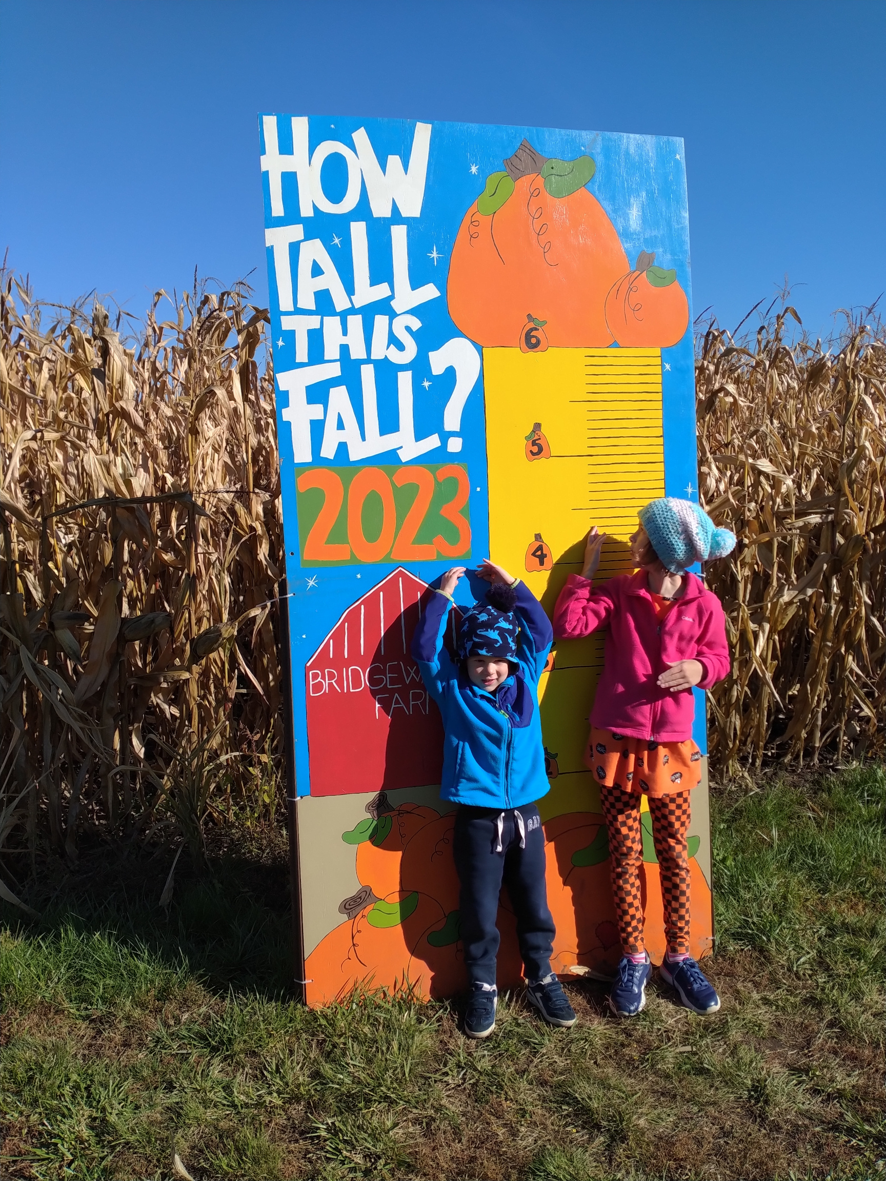 Izzy, especially tall for her age, and her brother check their height at Bridgewater Farm. (Minnesota Prairie Roots copyrighted photo October 2023)