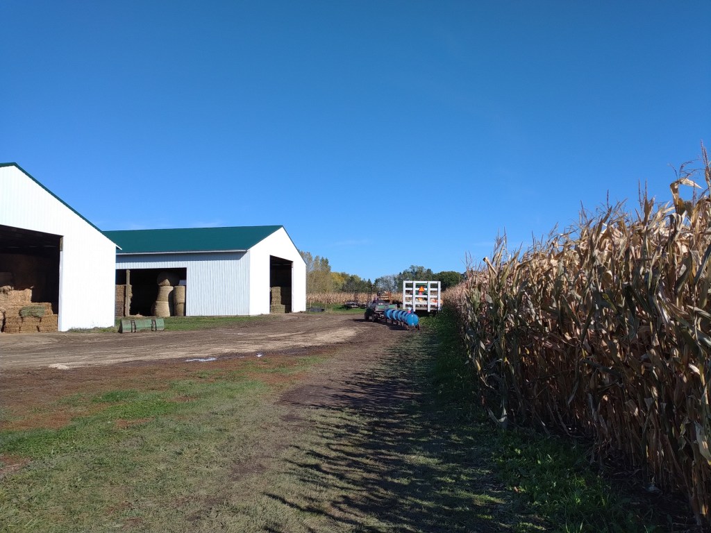 A barrel train heads toward the pole shed, aside the corn maze at Bridgewater Farm. (Minnesota Prairie Roots copyrighted photo October 2023)