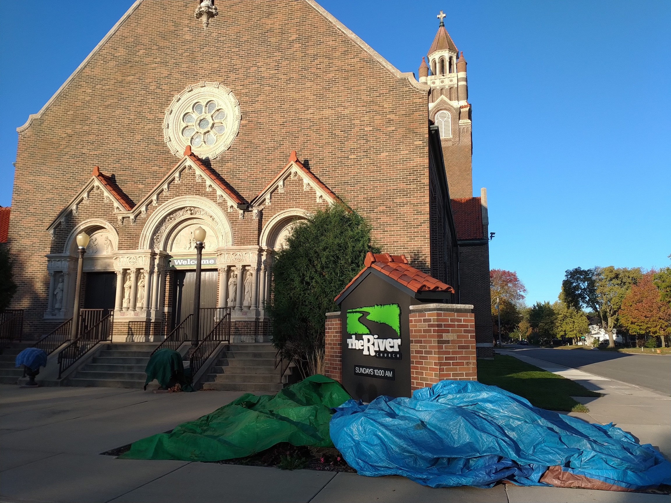 Across the street from the apartments, blankets and tarps draped flowers and plants at The River Church.