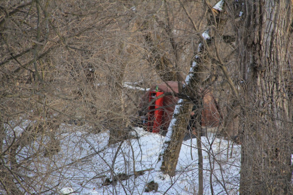 On a recent afternoon along the trail, with Canon camera in hand, I spotted a flash of red across the river in the woods. From a distance and through the trees, I couldn’t clearly distinguish details. But I knew this was a temporary shelter for someone without a permanent home. I saw a person shoveling snow.