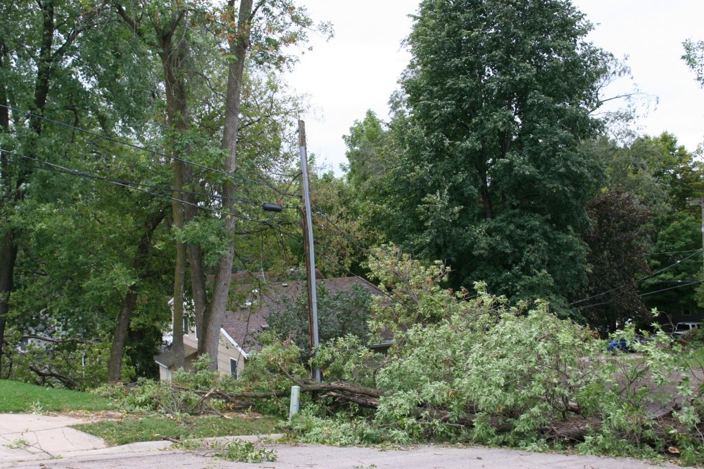 We are fortunate. In the last remnants of daylight, we see that the power line and meter are ripped from our house, the line slicing diagonally across our driveway behind the van. Everywhere, across our arterial street and up side streets, trees block roadways. It’s a mess.
