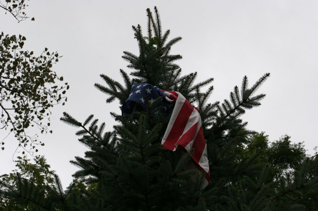My next-door neighbor’s flag was ripped from the pole, landing in the top of an evergreen.