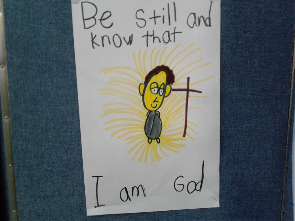 As I browsed the display, my eyes landed on the art of a first grader. My mouth actually dropped. The young student drew a simple picture illustrating Psalm 46:10. That scripture emerged as “my verse” in recent months, popping up in hymns, on a handcrafted paper angel, on a print in my mom’s care center, in devotions… And now here.