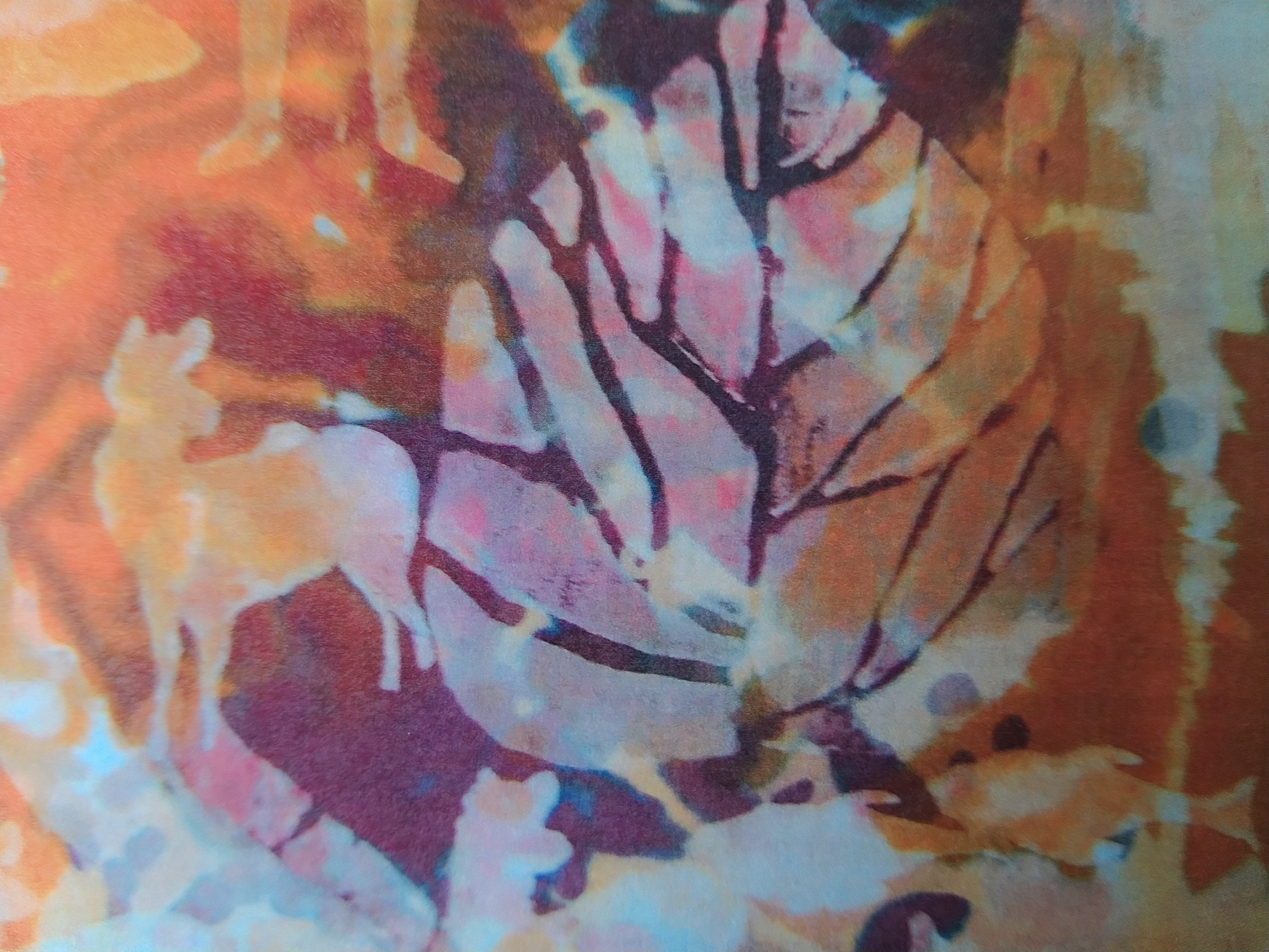 This is just a small part of Arlene Rolf’s “Creation” batik art, photographed from the cover of her funeral service worship folder. (Art copyrighted by Arlene Rolf; photo by Minnesota Prairie Roots, March 2024)
