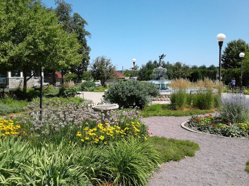 In between shopping, Randy and I stopped for a picnic lunch and a respite at the beautiful German Park a block from New Ulm’s main drag. Here a fountain centers lovely gardens and pieces of art.