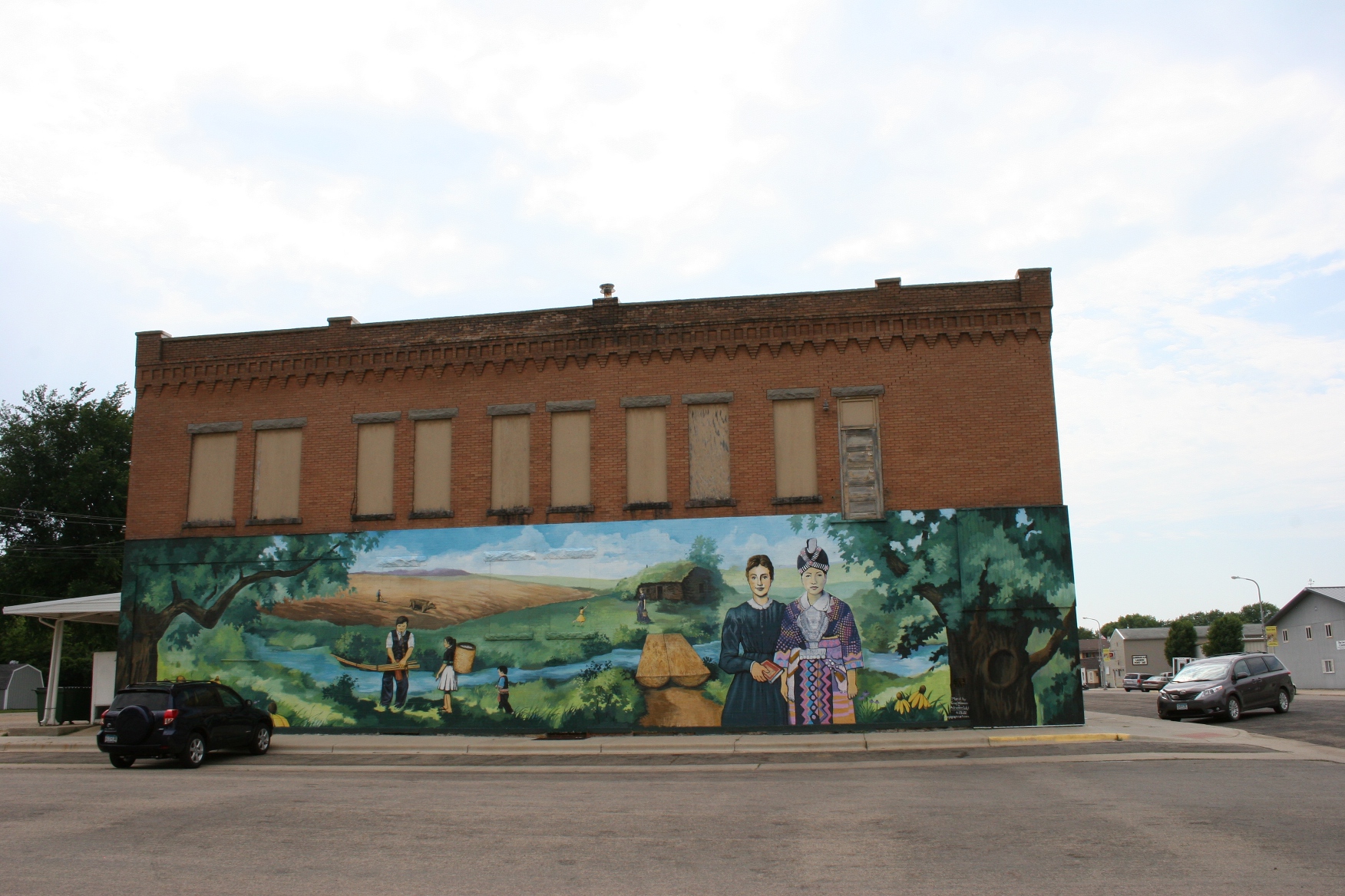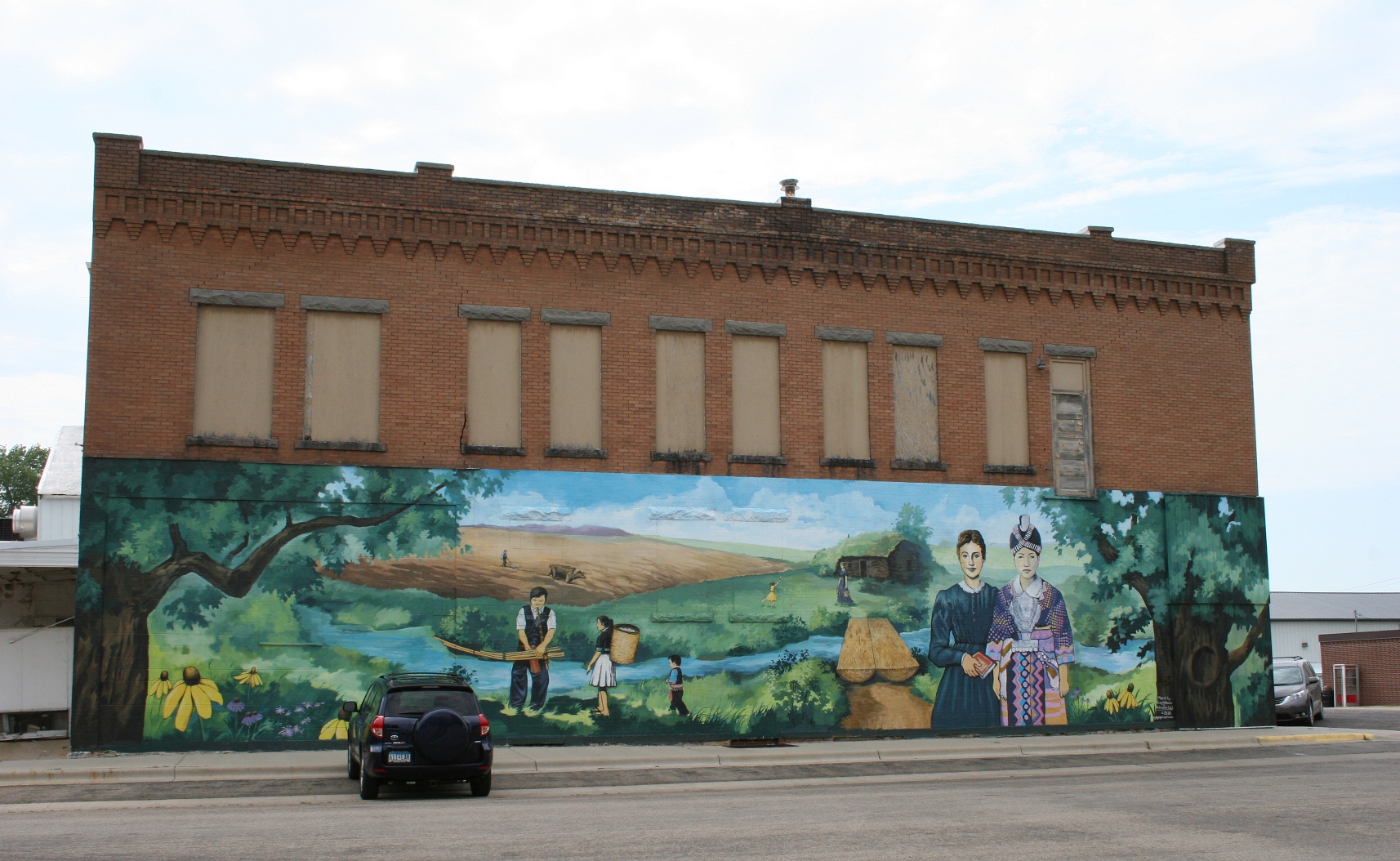MY NEPHEW, ADAM KLETSCHER, who lives and teaches in Walnut Grove, told me to check out the new mural downtown when I recently visited this southwestern Minnesota community. So, after leaving the Family Festival during the town’s annual celebration of Laura Ingalls Wilder’s Little House books, I stopped to photograph the 20-foot by 78-foot painting on the east side of Bubai Foods along Main Street.