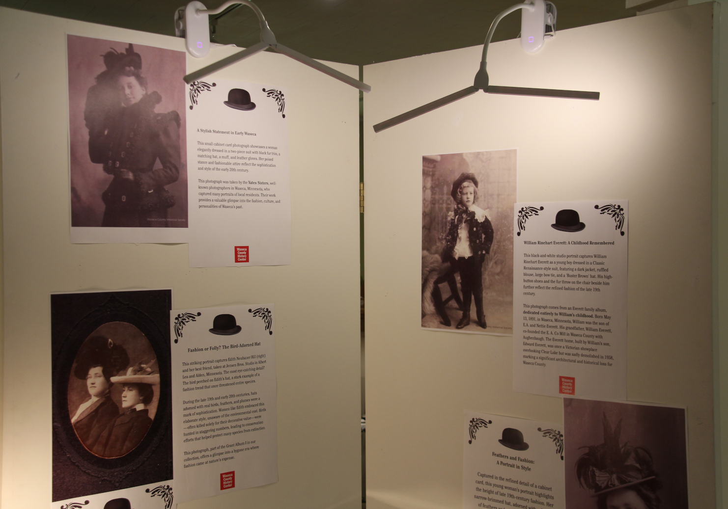Photos of fashionable hats shown in the HATS exhibit in Waseca, Minnesota. (Minnesota Prairie Roots copyrighted photo May 2025)