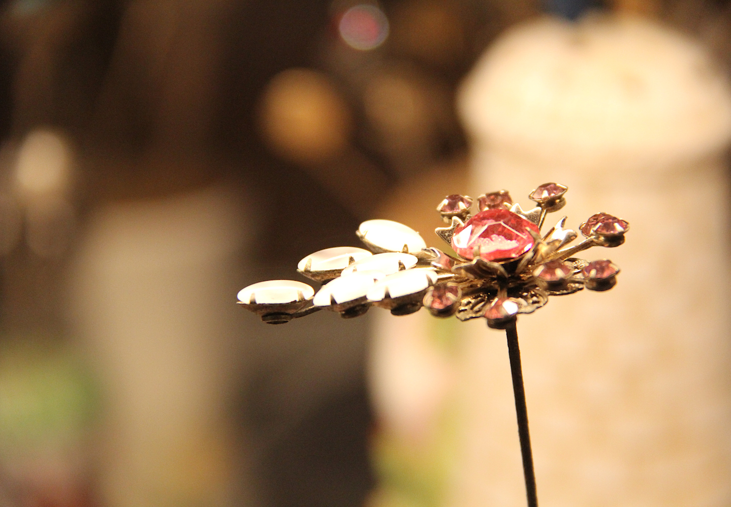 An entire glass case showcases vintage hatpins like this jeweled one. (Minnesota Prairie Roots copyrighted photo May 2025)