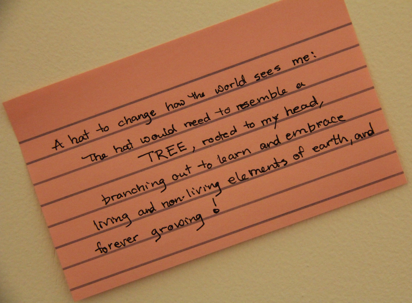 I especially liked the interactive HATBOX corner, a hidden space to sit, pull a writing prompt from a hatbox, think and reply to the prompt before anonymously posting it on a wall. That got me thinking about the many hats I’ve worn and still wear. Hats down, my most cherished hats are those of daughter, wife, mother and grandma. The others matter, too, but not as deeply, not as personally, as donning the hats of loving, caring for and supporting my closest family.