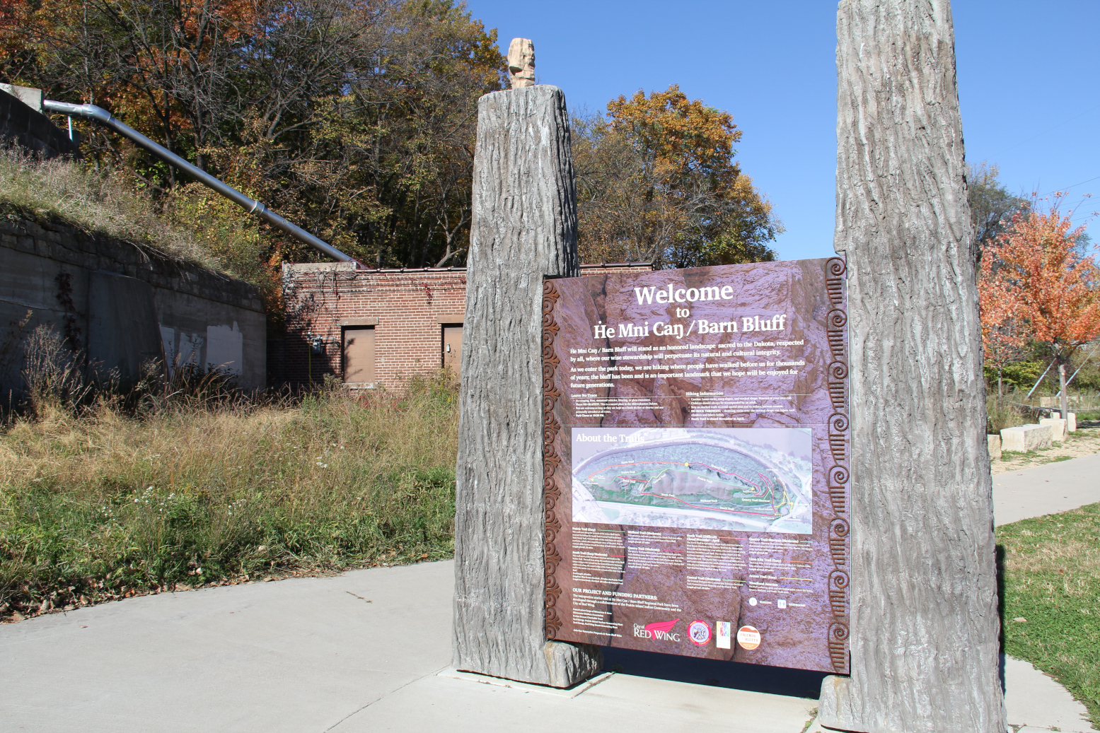 This sign welcomes visitors to Barn Bluff. (Minnesota Prairie Roots copyrighted photo October 2025)