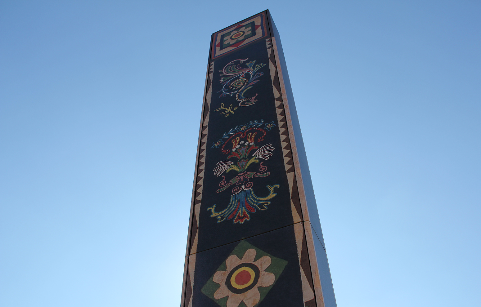 The pillars feature traditional Dakota patterns. (Minnesota Prairie Roots copyrighted photo October 2025)