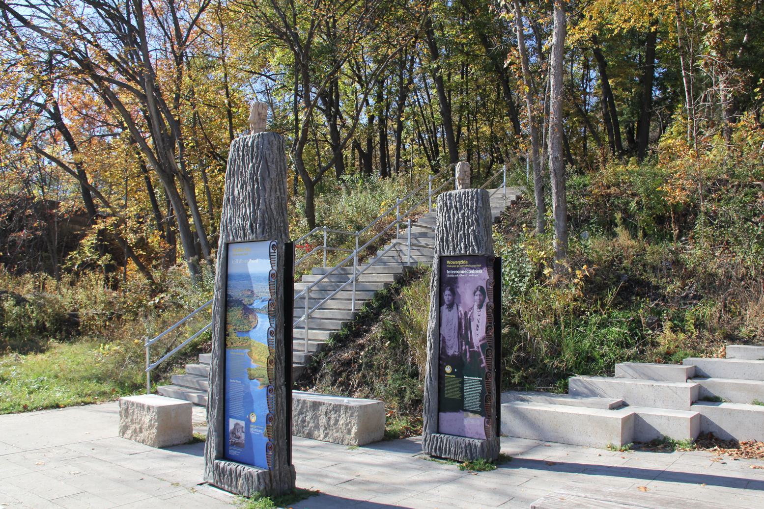 Two of the storytelling markers at the entrance plaza and steps leading to paths that take hikers onto and up the bluff. (Minnesota Prairie Roots copyrighted photo October 2025)