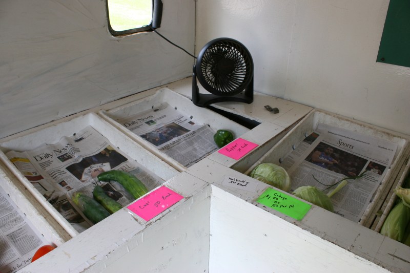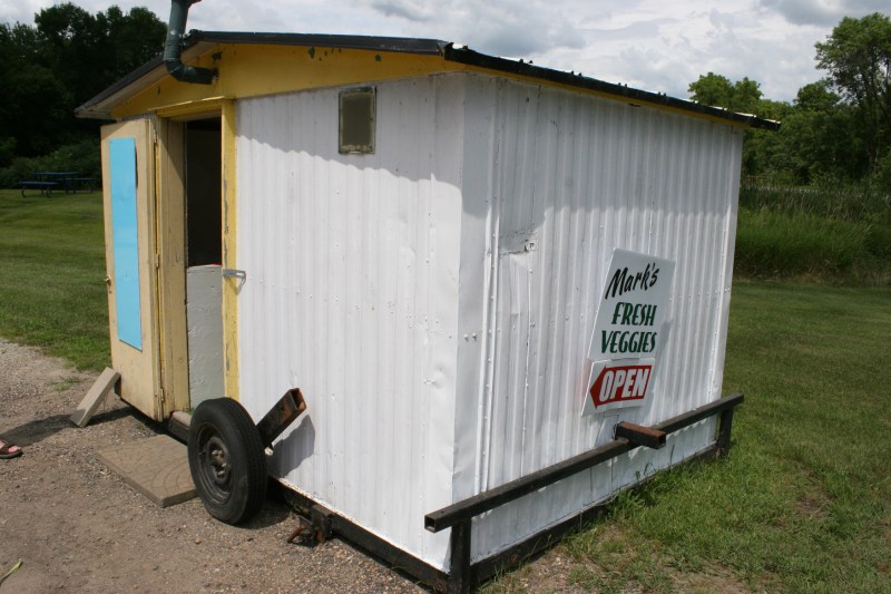Recently, while driving through Shieldsville, which is about 10 miles northwest of Faribault, Randy and I stopped to check out Mark’s produce, displayed inside a small metal shed next to the Lake Country parking lot. The portable shed appears to also serve as an ice fishing shelter in the winter.