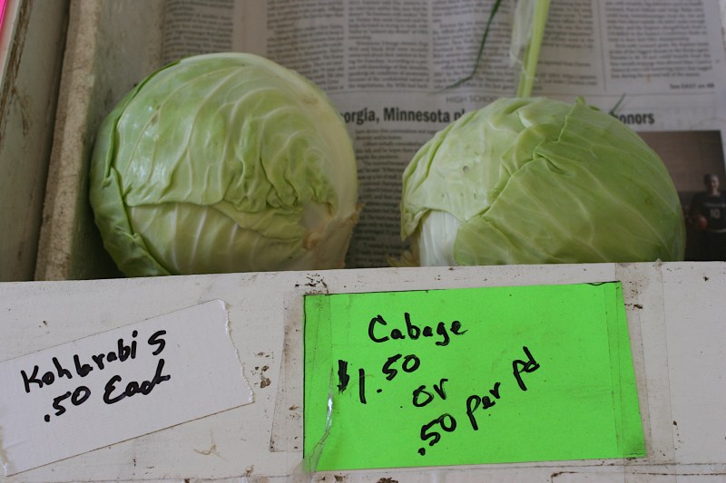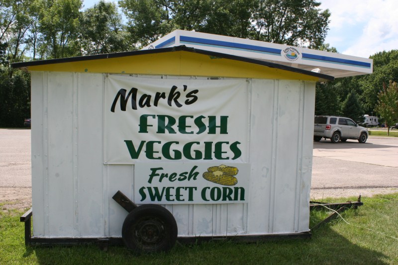 The sign on the back of the vegetable stand and visible from Minnesota State Highway 21 with the convenience store seen in the background.