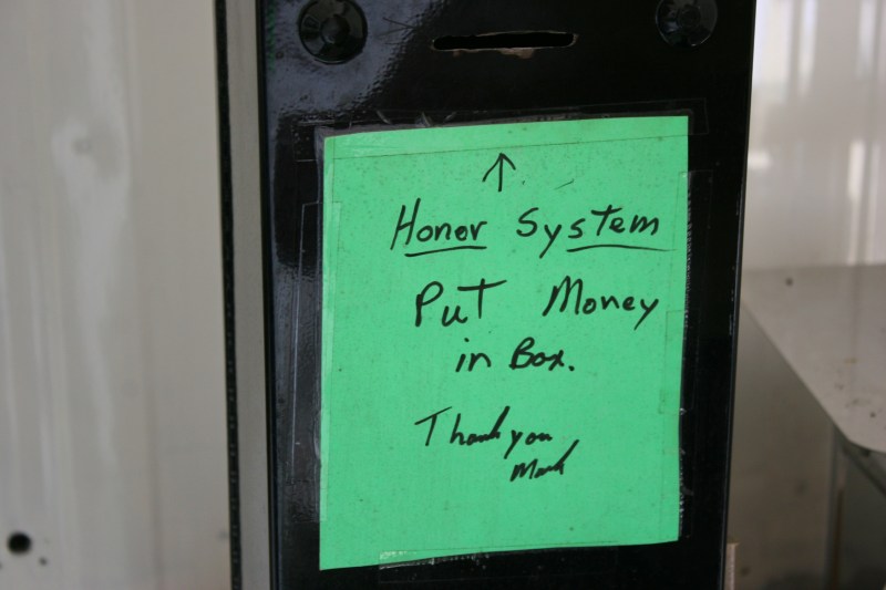 I expected payment would be inside the convenience store. But, nope, Mark has set up an honor system payment plan. I love this, when roadside vegetable vendors trust customers. Mark provides bags, a scale, and even a notebook to jot down purchases before dropping payment into a secure metal box. And then, he’s even thoughtfully set out hand sanitizer.