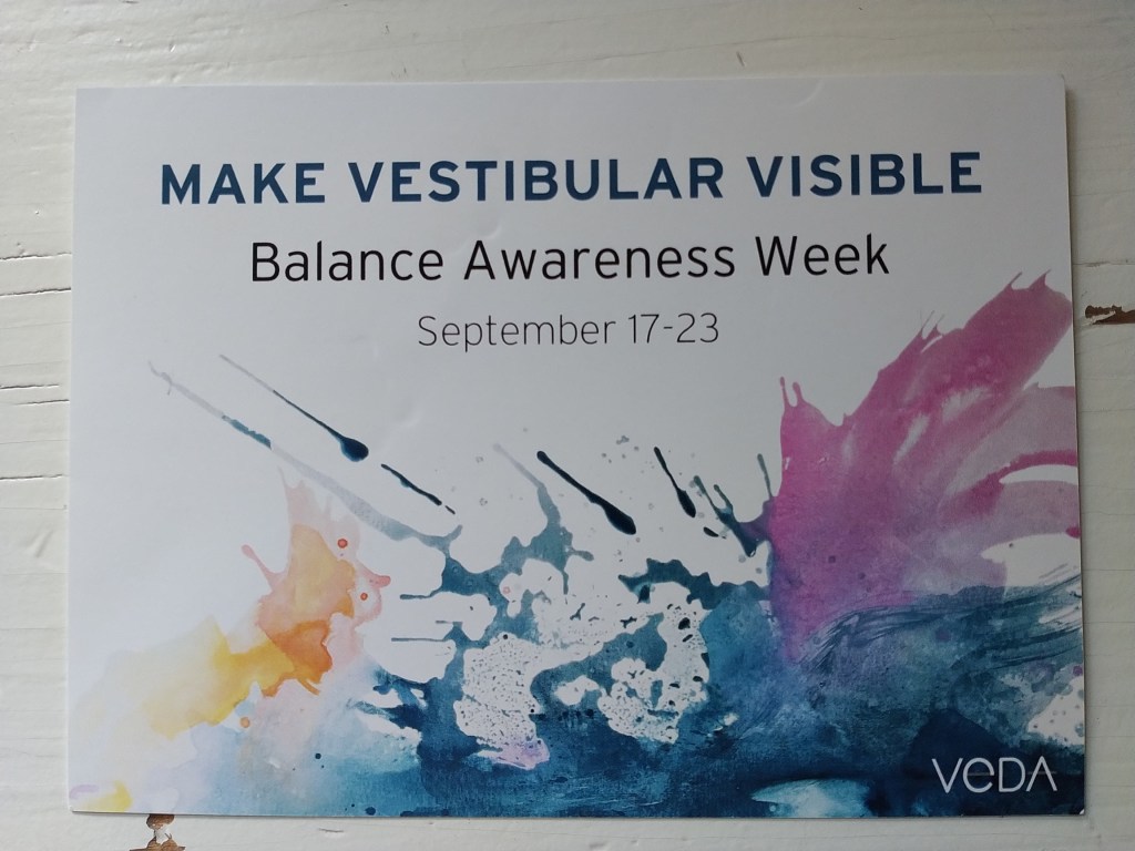 Today, though, I want to focus on balance, for two reasons. Imbalance was the first issue I overcame. And secondly, September 17-23 marks Balance Awareness Week, started in 1997 by the Vestibular Disorders Association. That national nonprofit is “a lifeline of support to anyone affected by vestibular (inner-ear and brain balance) disorders.” VeDA has proven an invaluable resource for me in learning about my vestibular-based diagnoses.