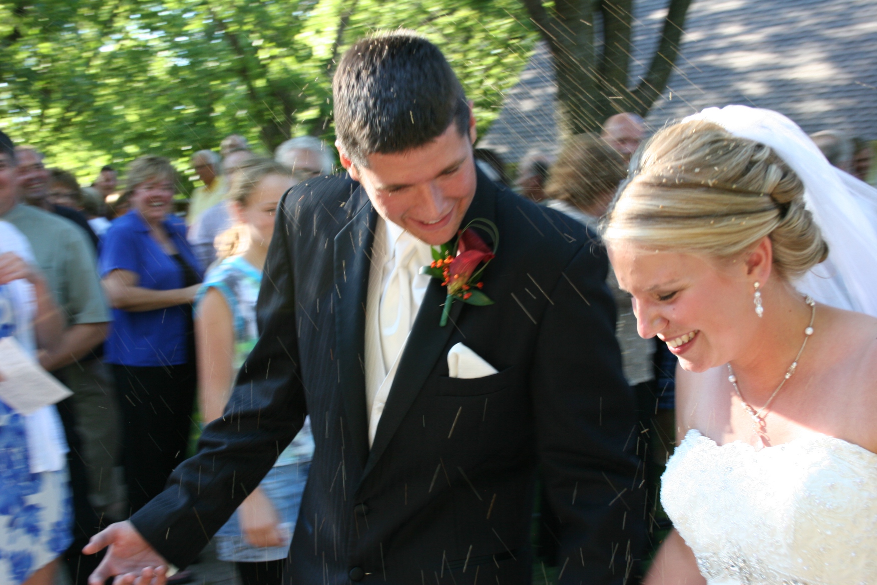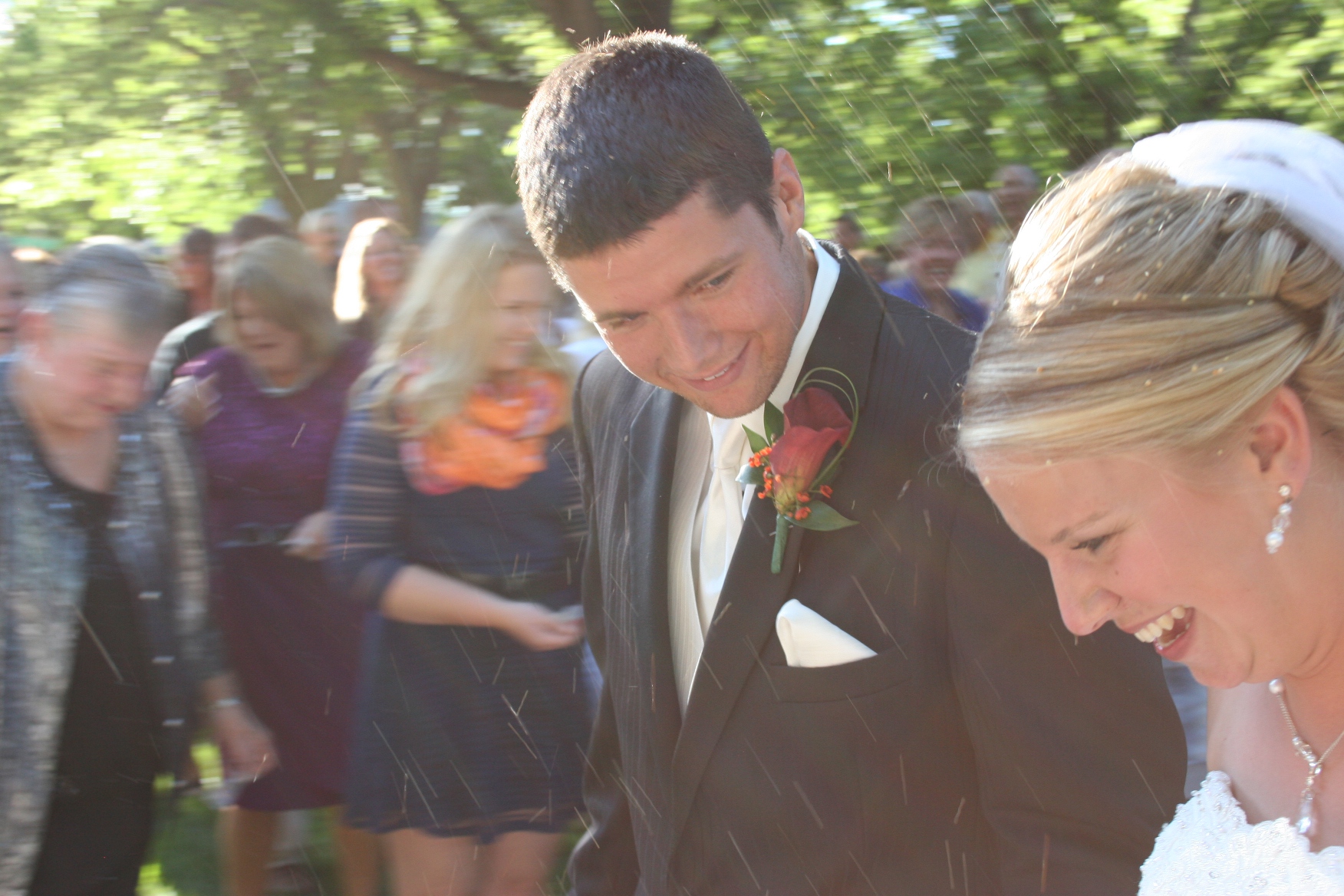 Carlyn and Jared leave the church in the early evening, showered with birdseed.