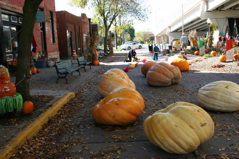 MASSIVE MAMMOTH PUMPKINS sprawl across brick and cement walkways under the bridge in Wabasha in this season of autumn. Here among dried leaves drifted from trees and below traffic crossing the Mississippi River between Minnesota and Wisconsin, locals have staged the Pumpkin Patch.