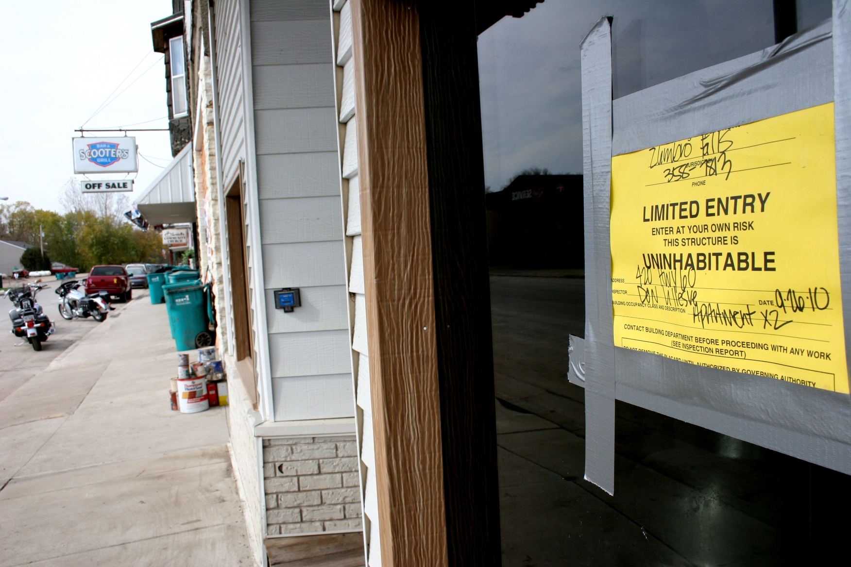 A building marked as uninhabitable in downtown Zumbro Falls, photographed on October 10.