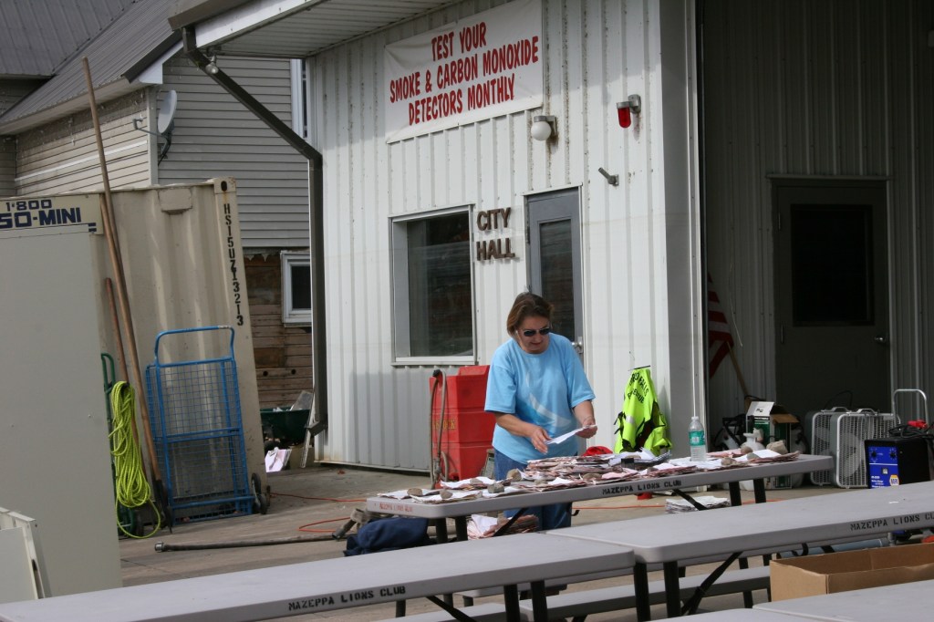Just steps away outside of city hall, which is a corner of the fire station, a woman sorted through stacks and stacks of dried city paperwork anchored by stones on a picnic table belonging to the Mazeppa Lions Club.